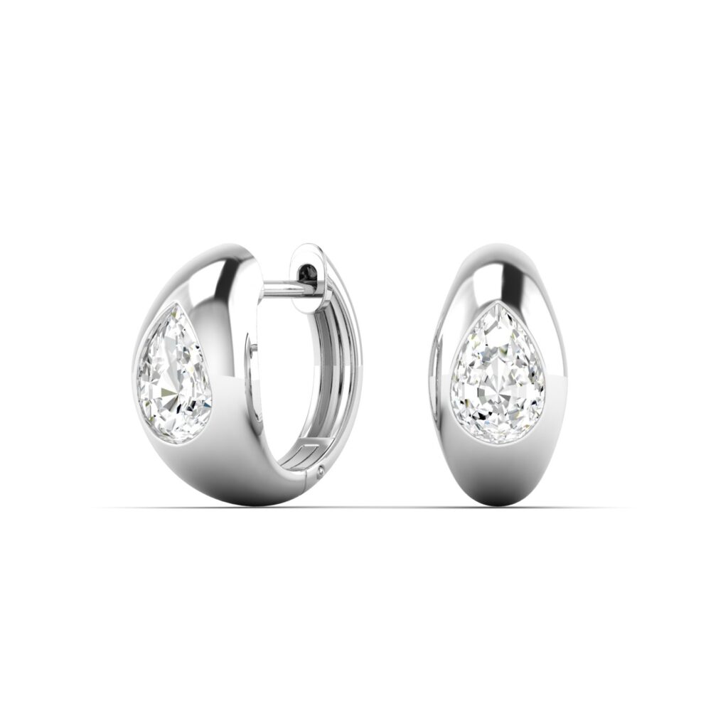 Graceful with a modern edge, these dome shaped huggies feature pear cut lab grown diamonds totaling 1.00ctw. The teardrop silhouette sparkles beautifully within the sculptural design, offering a blend of softness and contemporary style. Crafted to sit close to the ear, they’re available in 14kt yellow or white gold.