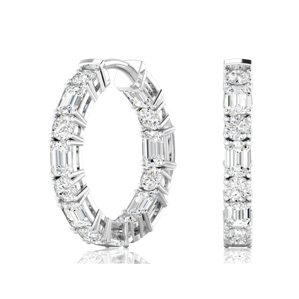 A bold statement with timeless elegance. These hoop earrings feature a striking combination of emerald cut and round brilliant lab grown diamonds, totaling 5.00ctw. The alternating shapes create dynamic sparkle and dimension, giving these hoops a sophisticated edge while maintaining classic appeal. With an inside-out design, the diamonds line both the inner and outer curves of the hoop, ensuring continuous brilliance from every angle.