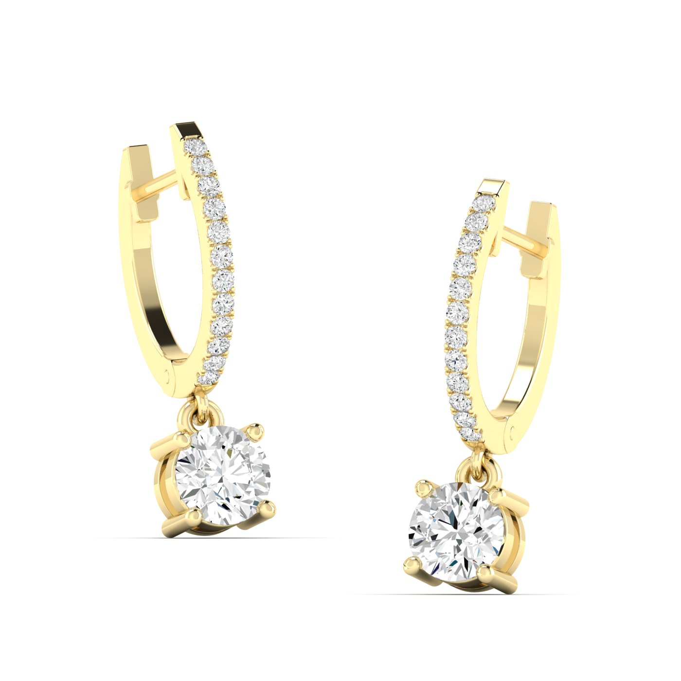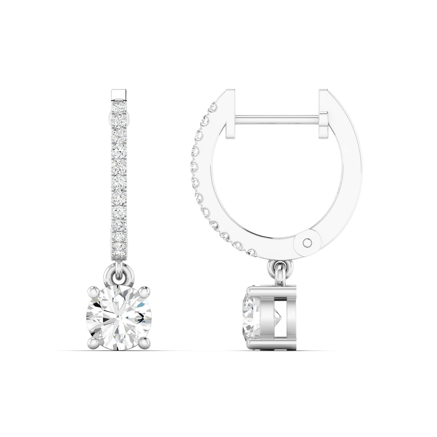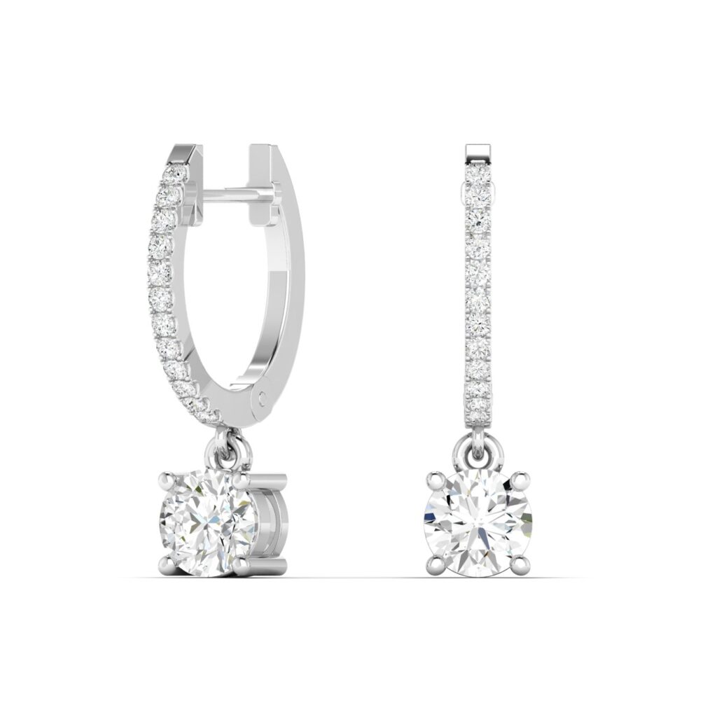Timeless sparkle in a modern design. These earrings feature 1.20ct total weight of lab grown diamonds, with a round brilliant diamond dangling at the center. The hoop is set with additional round brilliant lab grown diamonds, creating continuous radiance that enhances the central stone’s brilliance. A refined design with movement, perfect for everyday wear or special occasions.
