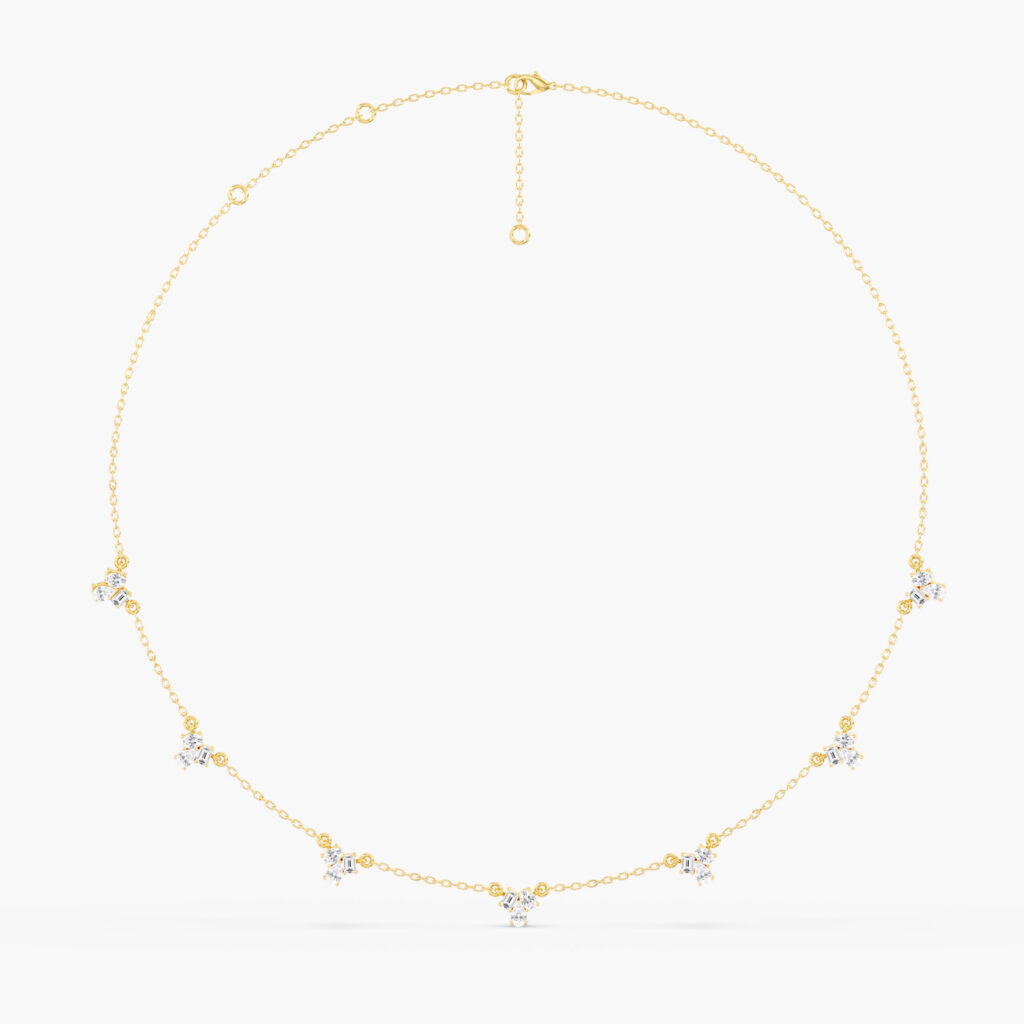 A bold evolution of the Trio design. This necklace features seven clusters of lab grown diamonds—emerald cut, oval, and pear—arranged along the chain for continuous brilliance. With a total weight of 1.80ctw, the repeated trio motif creates rhythm, sparkle, and a refined yet modern look. Perfect for layering or wearing as a statement piece.